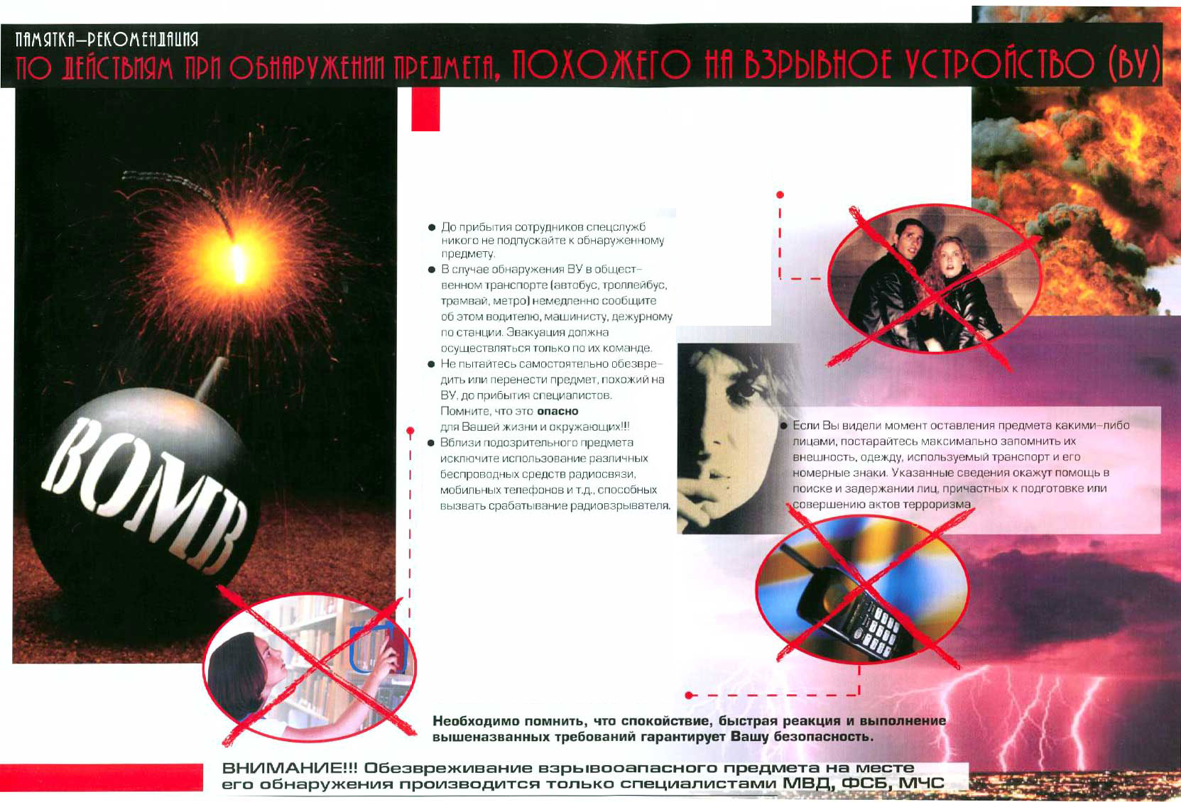 При обнаружении забытых вещей, не трогая их, сообщите об этом водителю, сотрудникам объекта, службы безопасности, органов милиции. Не пытайтесь заглянуть внутрь подозрительного пакета, коробки, иного предмета.
